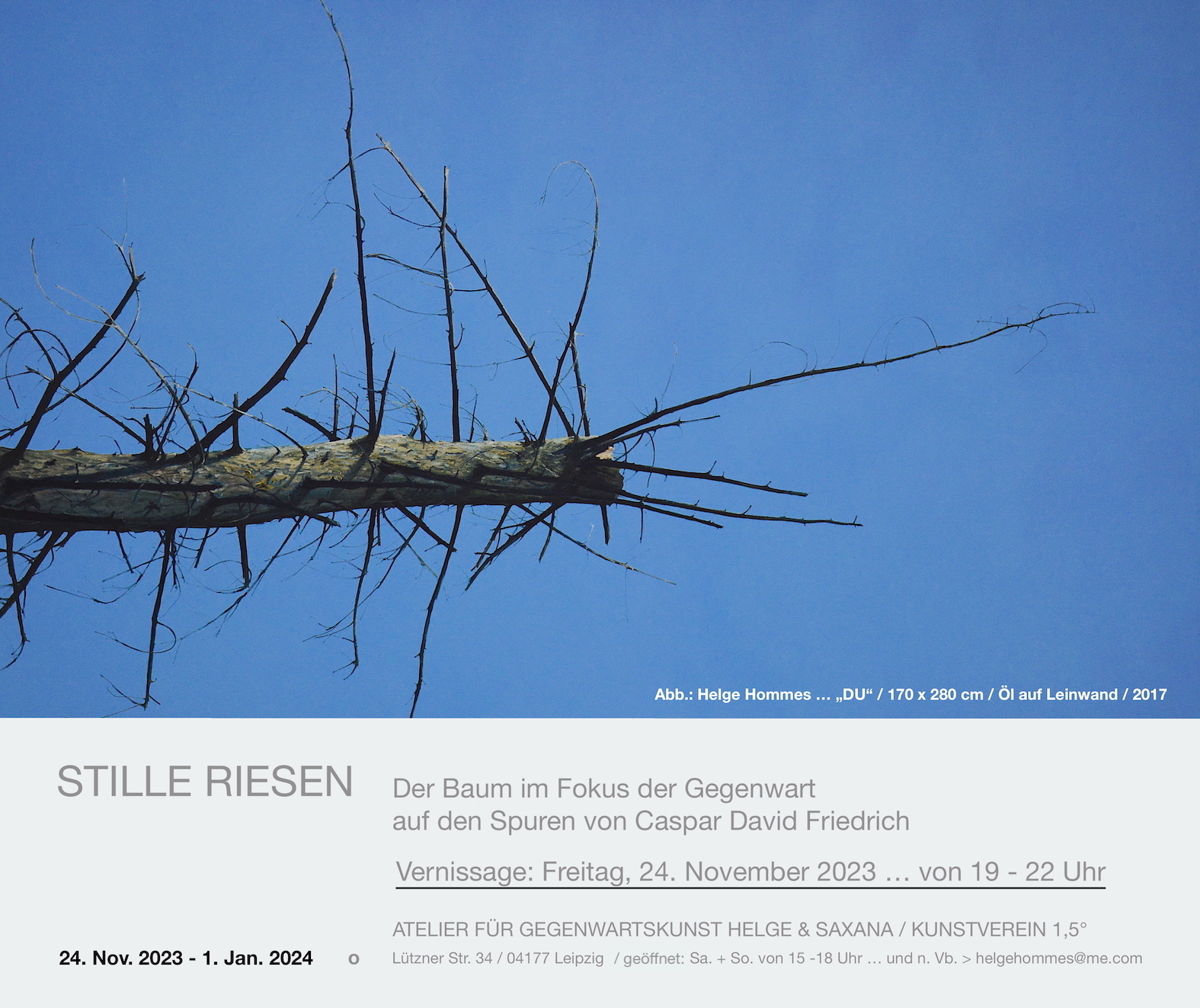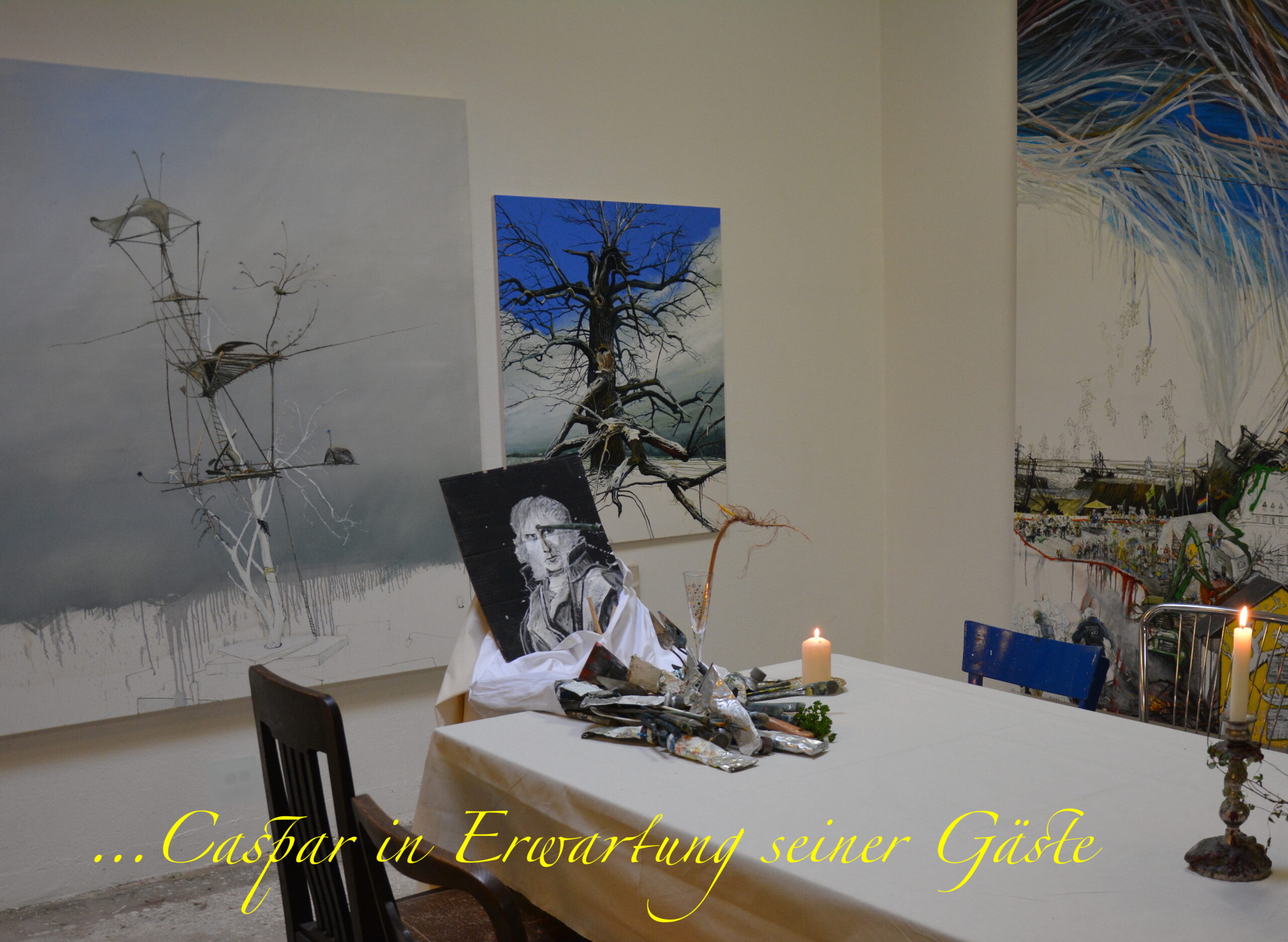 On November 24th, 2023 we opened a small, fine interim exhibition in memory of Caspar David Friedrich with the title: SILENT GIANTS The tree in the focus of the present – in the footsteps of Caspar David Friedrich The tree is perceived as a contemporary central being in the opposite, personified and honored in a contemporary way in relation to CDF and brought into diverse artistic focus. As a special event at the end of the exhibition, we invited you on New Year’s Day 2024, On the 1st day of the 250th birthday anniversary year of the painter – icon, people united vegan birthday anniversary menu No. 250 in the exhibition and celebrated and honored CDF looking back and considering what awaits us today in the future…